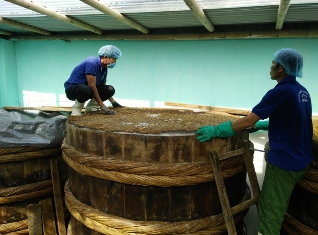 Cá và muối được lựa chọn với tỷ lệ 3 cá 1 muối cho vào thùng gỗ bời lời để ủ chượp nước mắm từ 12-24 tháng. Ẩnh sưu tầm